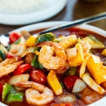 Sweet-and-sour stir fry, shown with shrimp, contains fresh pineapple, bell peppers, onions, cucumbers, tomatoes and scallions nestled in a scrumptious red sauce.