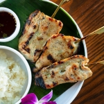 Moo ping, which comprises pork skewers marinated in coconut milk, is served with sticky rice and a spicy dipping sauce.