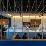 The restaurant’s contemporary interior features bamboo-covered light fixtures, high ceilings and white tiled walls. A hanging rope section of the dining room pays homage to the floating markets found in Thailand, while a beautifully landscaped outdoor patio features an eye-catching fountain that’s illuminated at night.