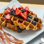 Customers can order traditional plates like waffles, fresh fruit and bacon from the all-day breakfast menu, or they can pick hearty dishes like braised rosemary pork hash topped with eggs.