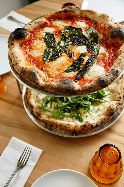 Thin-crusted, 13-inch pizzas are cooked in an exquisite Stefano Ferrara wood-burning oven imported from Naples, Italy.