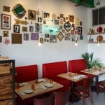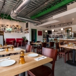 Cement flooring and wood-topped tables and an open kitchen add to the restaurant’s casual atmosphere.