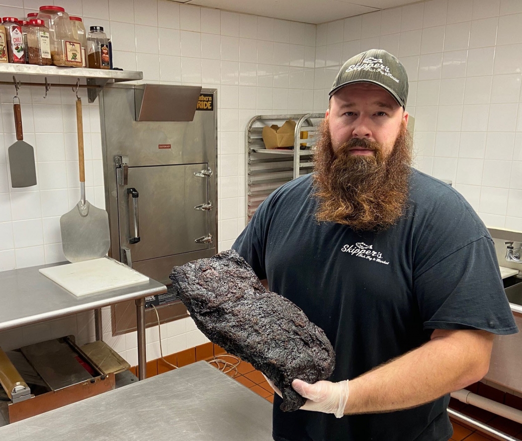 At Skipper's Seafood, James Johnson holds a brisket that is fresh out of the smoker.
