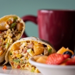 Inspired by fictional character Ron Swanson from the television sitcom “Parks and Recreation,” the popular Big Swanson burrito includes bacon, sausage, ham, scrambled eggs, home fries, confetti peppers, mixed cheese and a side of salsa verde.