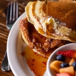 The ample pancake sandwich features fried chicken nestled between flapjacks drizzled with Sriracha-infused honey.