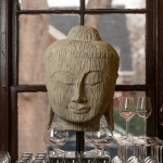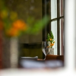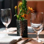 As for the interior decor, Chuong says he aimed to merge the house’s vintage elements with his own distinctive vision. Striking wood floors undergird traditional-style tables and chairs covered with amber-hued fabric. Walls are adorned with Eastern-influenced artwork and authentic Vietnamese instruments. Exquisite fresh flowers on each table are sourced from Raleigh’s Watered Garden Florist.