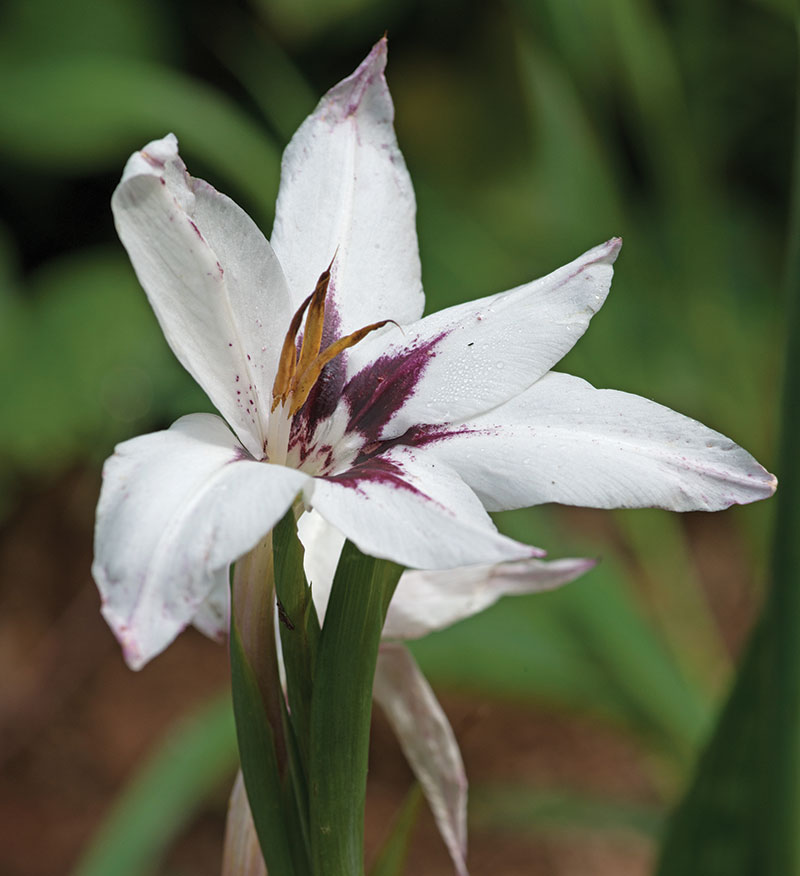 Acidanthera is a gladiolus kin originally from mountainous eastern Africa. Like a glad, it sends up slender blades of greenery before long flower stalks come out to play. And being from high country, it prefers well-draining growing ground.