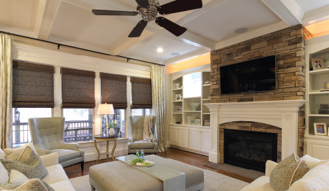 The keeping room is a favorite feature of Rick Barrett, owner of CityScape Builders. The exposed beams and stone fireplace add warmth and coziness to the grandeur of the vaulted ceiling.