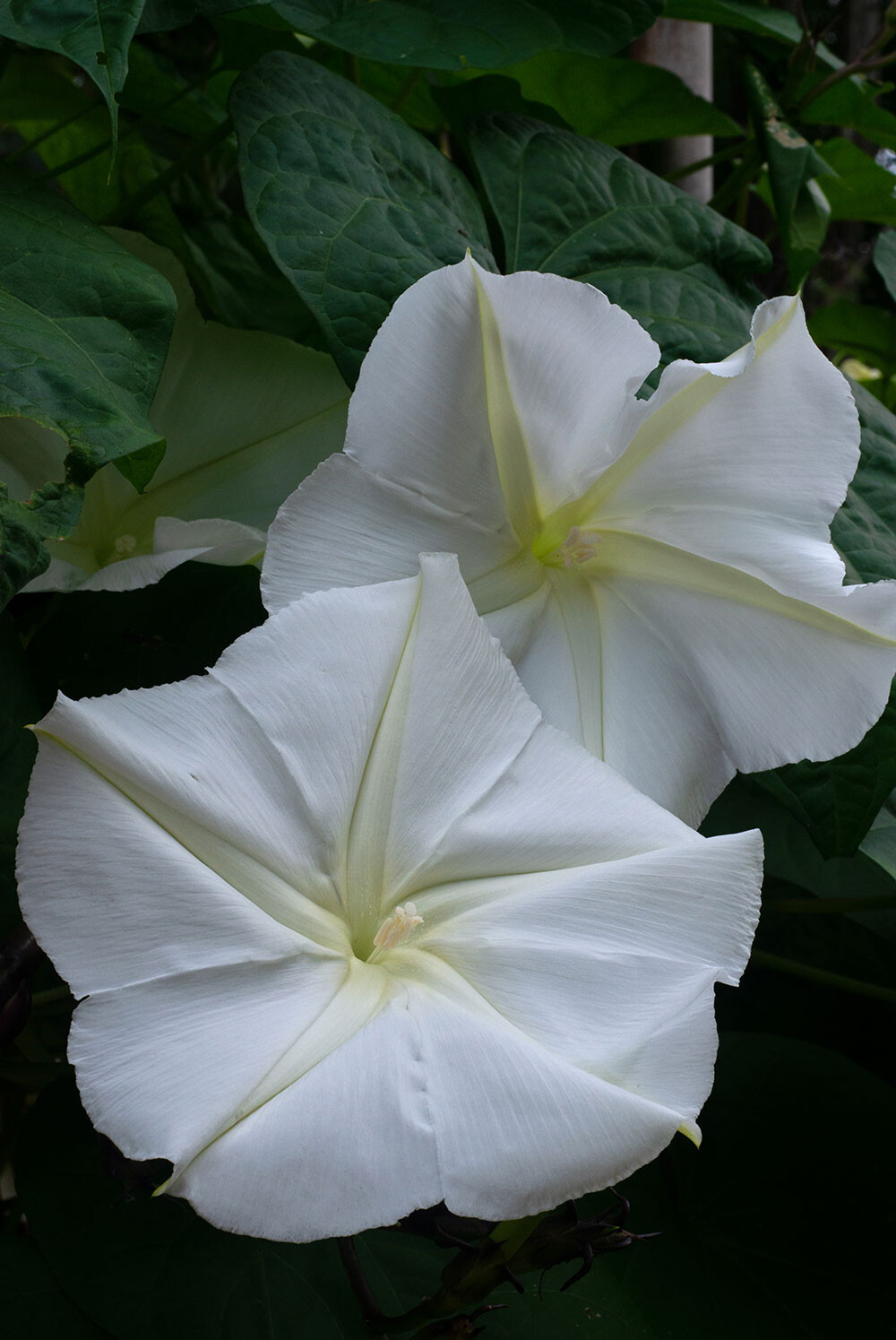 August. The Late Show is beginning. By mid-month, vines have tumbled over the top of my deck railing, flaunting their first flowers — which only last a single night.
