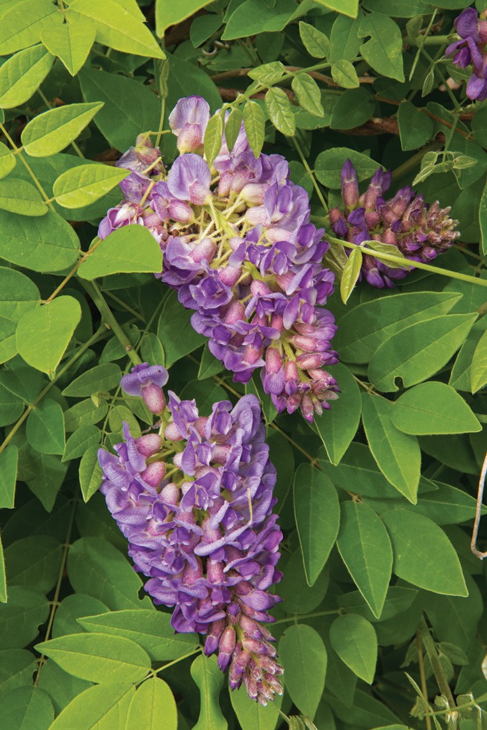 Dripping with light purple, slightly fragrant racemes up to 12 inches long in late spring, ‘Amethyst Falls’ is a deer-resistant, drought-tolerant, sun-loving beauty that can add grace to a clunky fence or bare trellis. In addition, it is sterile, meaning no weedy seedlings will invade your landscape. And, no, it won’t be hard to find — I have spotted it at many local nurseries.