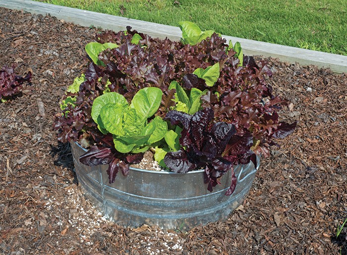 Don’t have room for a full-blown veggie patch? Grow small in large containers, such as this tub o’ lettuce.