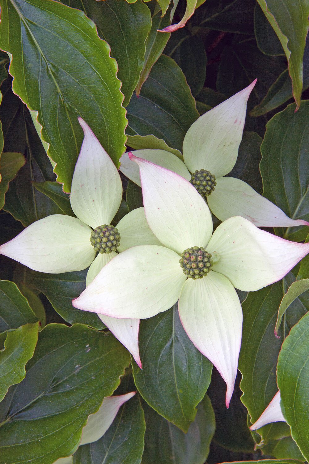 Kousa dogwood’s flowers not only open later, but they have their own look, too. Their petals (actually bracts) are stubbier — in an attractive way — and pointed on the ends. In addition, its flowers tend to cluster and flow more, creating pleasant sweeps of blooms made brighter by the tree’s flush backdrop of rich green leaves.