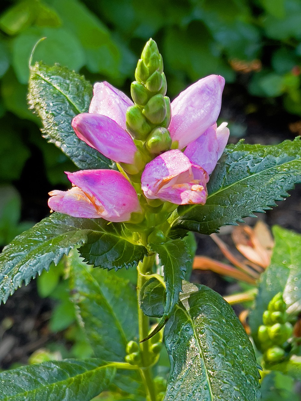 Turtlehead does provide visual satisfaction, but you have to be patient because it waits until the high summer to begin showing off its peculiar blossoms. By then, flower towers arise on sturdy, 2- to 3-foot stems with the lower clusters opening first, and then the bloom show steadily parades upward. This pleasant progression can last over a month.