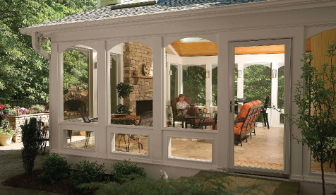Choosing real stone over cultured for the screen room fireplace and extending it all the way up the wall makes it the focal point of the room and gives it a finished look. The room has a light, bright, inviting feel.