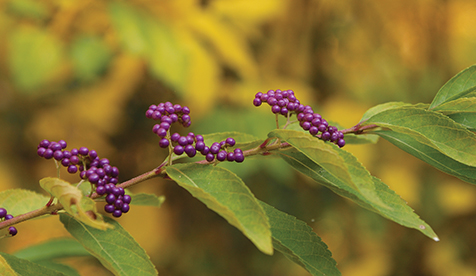 Yes, purple, which is brazenly flaunted in the fall by a botanical floozy known as beautyberry (Callicarpa sp.). Spending the warmer months slumbering in a sea of green, this bush celebrates summer’s exit in a pleasantly gaudy display of arching stems loaded with berry clusters that turn ultra-violet and scream, “Look at me!”