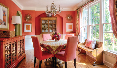 “Red is my color. I love it in almost every room in my house,” said Allen. “It just makes me happy. To me it’s almost a neutral.” Valances leave the view unobstructed but bring in Allen’s signature color and lots of pattern. Grasscloth wallpaper adds warmth and texture and ties in the woven dining chairs.