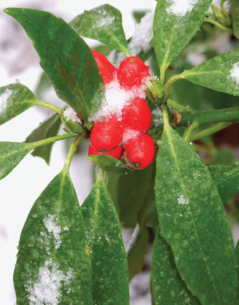 There are non-variegated aucubas, but while these all-green plants might predictably fade into the landscape during the summer, come early winter they serve up a holiday present.